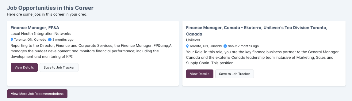 After uploading your resume, click Explore Careers. This will bring you to a list of careers that best match your skills. You can click on one to Learn More and then scroll down to see recommended jobs. Click on View More Job Recommendations to find more recommended job postings.